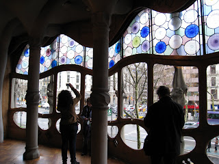 意外地竟然有附中文語音導覽!一邊聽導覽一邊參觀一邊照相真是忙碌XD!不愧是我最愛的高第,精美的設計、令人讚嘆的功夫、天馬行空的想像,讓爸媽也看得嘖嘖稱奇,每一個房間、每一扇窗戶、每個樓梯、每一個抽風口;如海螺的天花板、如大嘴的窗戶、如海浪的圍牆、如峰窩的牆壁、如脊骨的樓梯扶手……如果說建築是人造,那高第就是把自然與人為徹底完美的結合。繽紛五彩的玻璃窗、毫無直線或直角,高第的天才、高第的想像、高第對宗教與建築的熱誠,都讓是我對巴賽的嚮往的開始,而如今,尾聲也是在這裡。